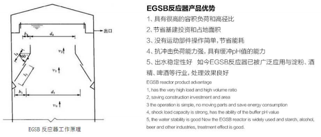 EGSB 厭氧反應器是繼UASB 之后的一種新型的厭氧反應器。它由布水器、三相分離器、集氣室及外部進水系統組成一個完整系統。廢水經過污水泵進入EGSB 厭氧反應器的有機物充分與厭氧罐底部的污泥接觸,大部分被處理吸收。高水力負荷和高產氣負荷使污泥與有機物充分混合,污泥處于充分的膨脹狀態,傳質速率高,大大提高了厭氧反應速率和有機負荷。所產生的沼氣上升到頂部經過三相分離器把污泥、污水、沼氣分離開來。從實際運行情況看,EGSB 厭氧反應器對有機物的去除率高達85%以上,運行穩定,出水穩定,此EGSB  厭氧技術已經非常成熟,已經廣泛運用到國內中大型企業。